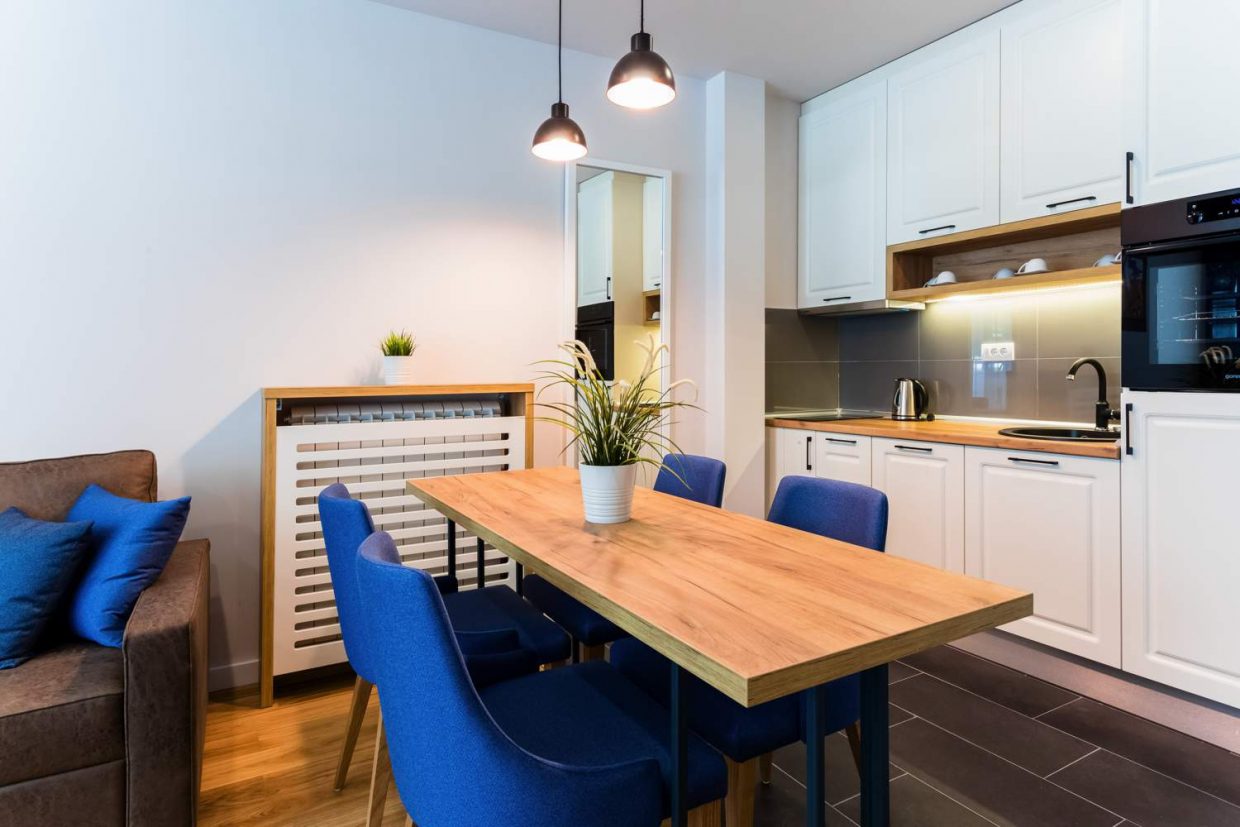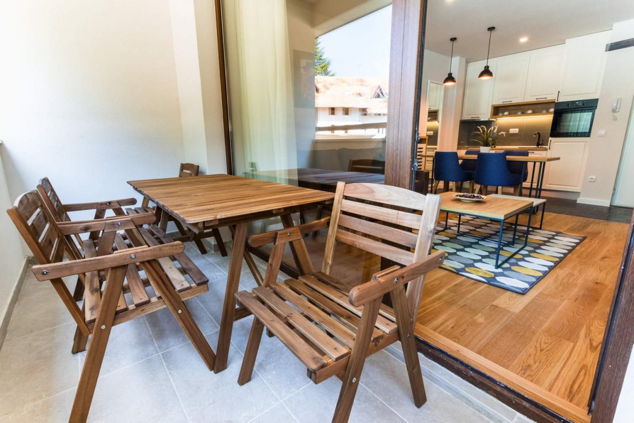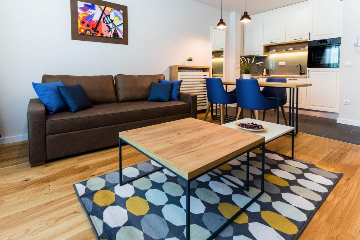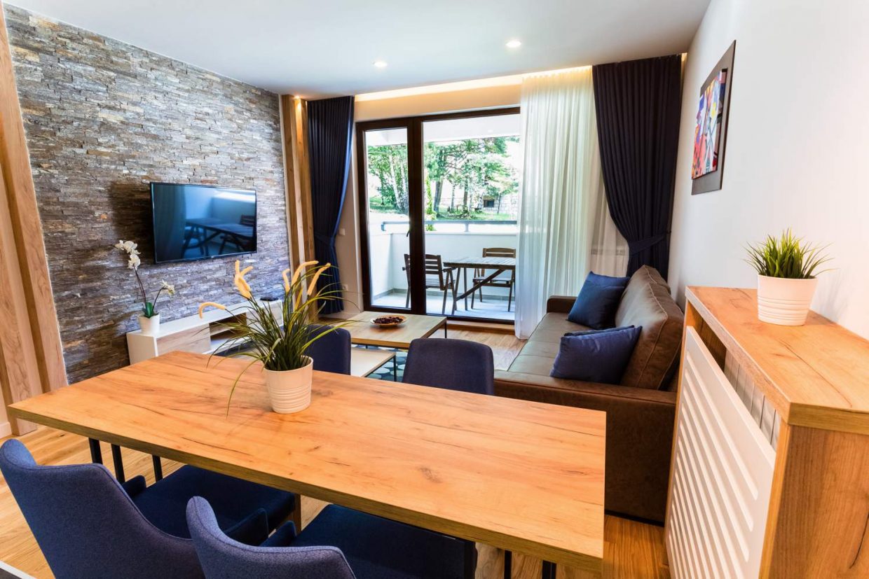 spavaćom sobom, površine 43m². Apartman poseduje kompletno opremljenu kuhinju sa trpezarijom,